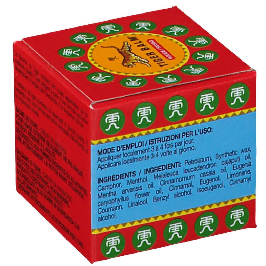 Composition du Baume du Tigre Rouge : Vaseline, Cire synthétique, Camphre, Menthol, Huiles essentielles de Cajeput (Melaleuca leucadendron), de Menthe des Champs (Mentha arvensis), de Cannelle Cassia (Cinnamomum cassia) et de Clou de Girofle (Eugenia caryophyllus), Cinnamal, Eugénol, Limonène, Coumarine, Linalol, Alcool benzylique, Isoeugénol, Alcool cinnamique.