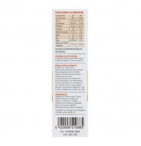 Composition d'Origan+ : huile de Colza bio, gélatine marine bio, huile essentielle d'Origan (Origanum vulgare), huile essentielle de Citron (Citrus limon), glycérine, tocopherol (antioyxdant).