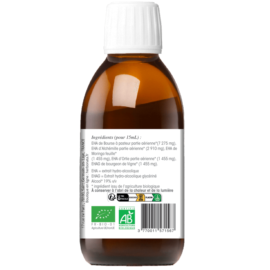 EHA de Bourse à pasteur partie aérienne (7 275 mg), EHA d'Alchemille partie aérienne* (2 910 mg). EHA de Moringa feuille(1 455 mg), EHA d'Ortie partie aérienne* (1 455 mg).