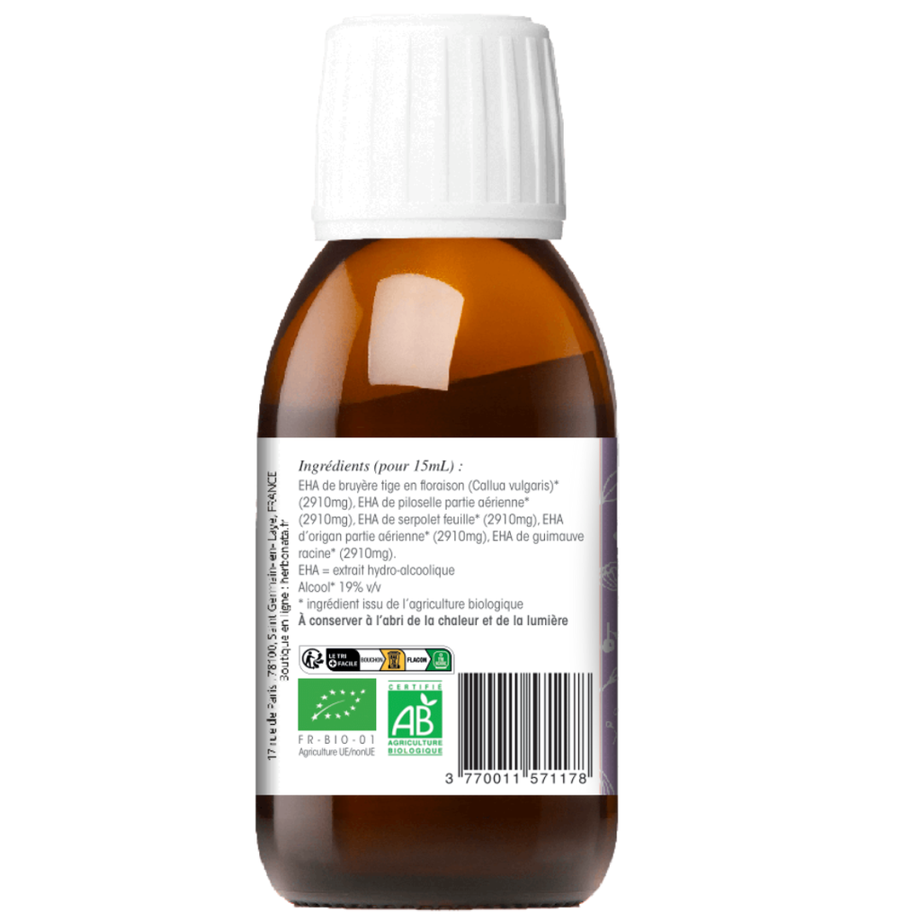 EHA de Bruyère tige en floraison (2910mg), EHA de Piloselle partie aérienne (2910mg), EHA de Serpolet feuille (2910mg), EHA d'Origan partie aérienne (2910mg), EHA de Guimauve racine (2910mg).