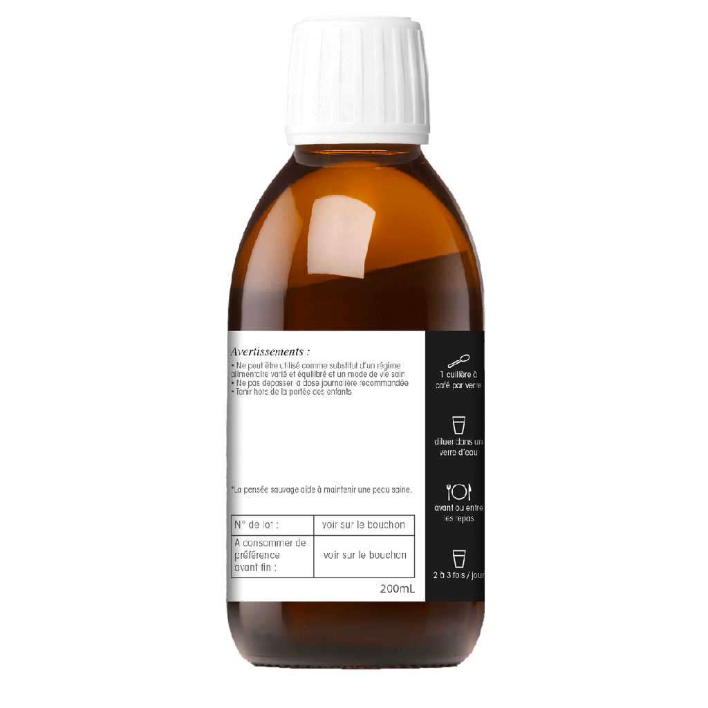 EHA de Pensée sauvage partie aérienne (4388 mg), EHA de Bardane racine (2925 mg), EHA de Fumeterre partie aérienne (2925 mg), EHA d'Ortie feuille (2194 mg), EHA de Bourrache fleur et graine (2194 mg).