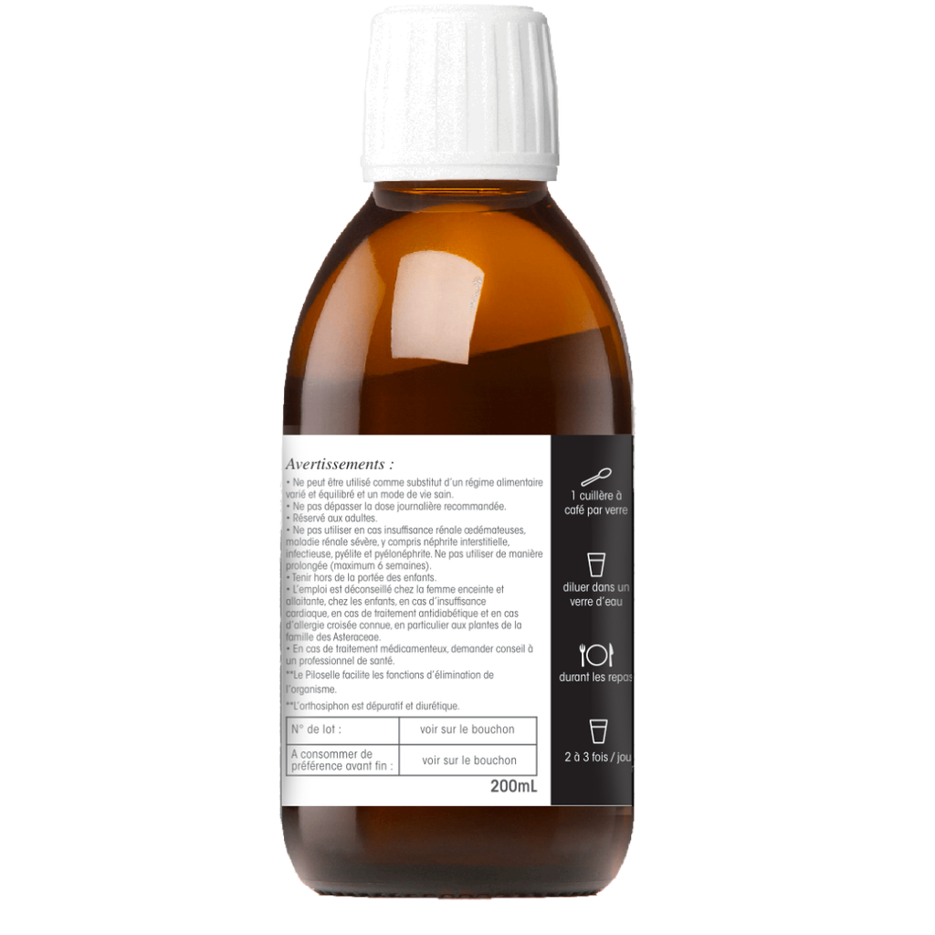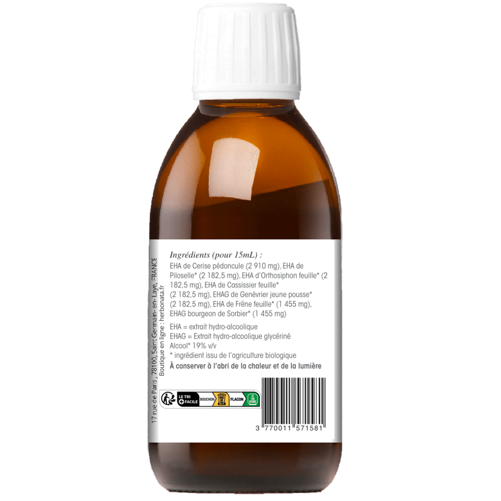 EHA de Cerise pédoncule (2 910 mg), EHA de Piloselle (2 182.5 mg), EHA d'Orthosiphon feuille" (2 182.5 mg). EHA de Cassissier feuille (2 182,5 mg). EHAG de Genévrier jeune pousse*(2 182,5 mg). EHA de Frène feuille (1 455 mg).EHAG bourgeon de Sorbier (1 455 mg)