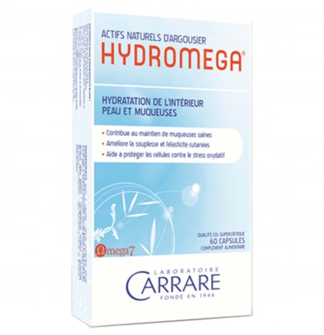 Composition d'Hydroméga (4 capsules) : Huile d'Argousier standardisée (Hippophae rhamnoides) issue de la pulpe et des baies (2000 mg dont 480 mg d'acide palmitoléique (oméga 7), 360 mg d'acide oléique (oméga 9), 120 mg d'acide cis-vaccénique (oméga 7), 340 mg d'acide linoléique (oméga 6), 260 mg d'acide alpha-linolénique (oméga 3)), Enveloppe d'origine végétale (amidon modifié de maïs, glycérol, carréghanes, phosphate disodique), Vitamine E (alpha-tocophérol, 8 mg soit 67% des valeurs nutritionnelles de référence), extrait de Romarin, Vitamine A (bêta-carotène, 800 µg soit 100% des valeurs nutritonnelles de référence).
