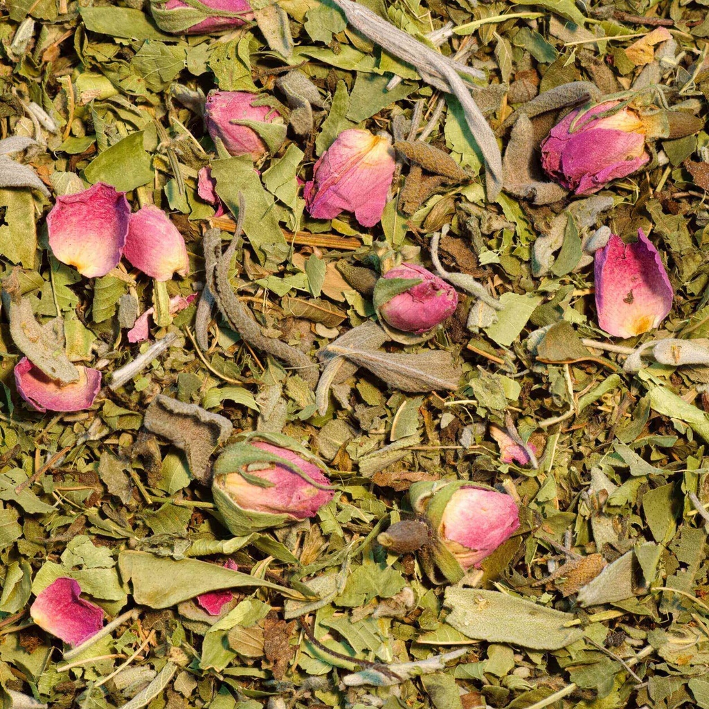 Composition de la tisane Apaisante : Marjolaine (feuilles), Mélisse (feuilles), Oranger (feuilles), Sauge (feuilles), Verveine (feuilles), Rose de Damas (boutons).