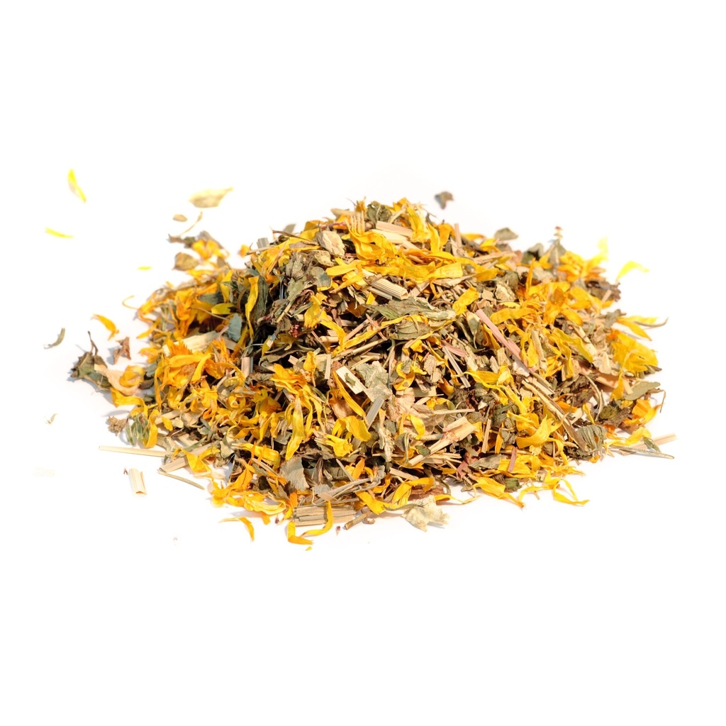 Composition de la tisane des Lendemains de soirées : Gingembre (racines), Boldo (feuilles), Menthe poivrée (feuilles), Romarin (feuilles), Citronnelle (plante), Chardon-Marie (plante), Calendula (pétales).