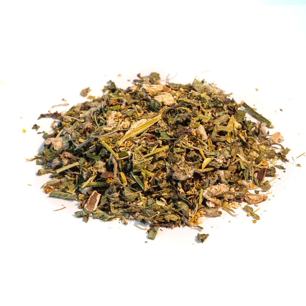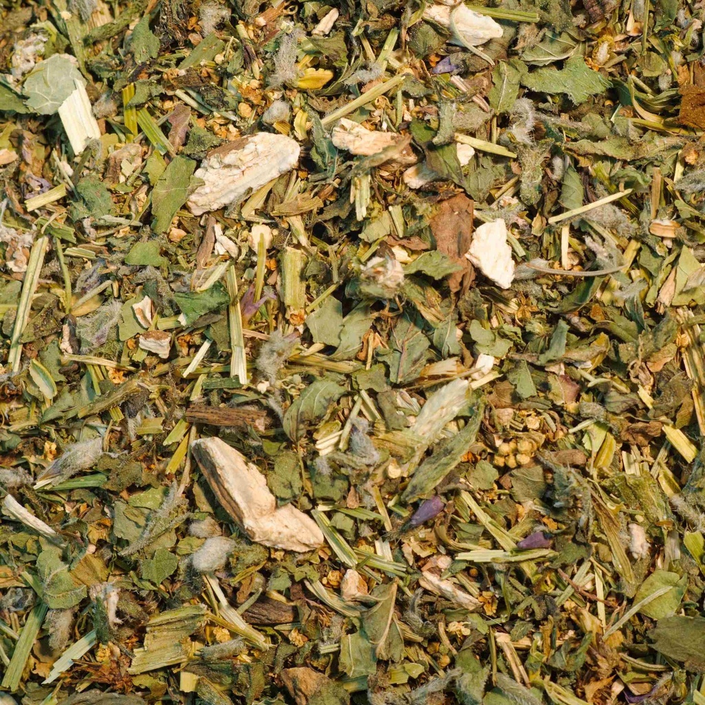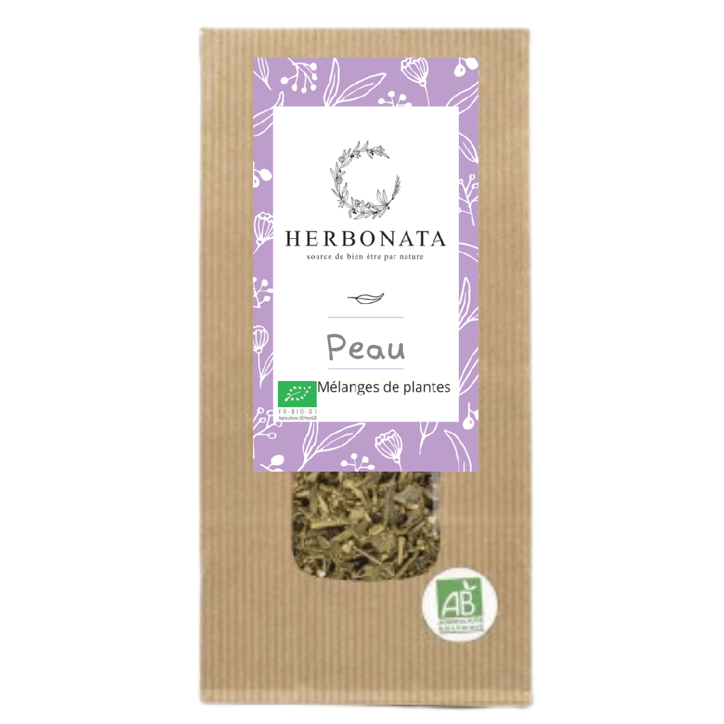 Composition de la tisane Peau : Bardane (racines), Pensée sauvage (partie aérienne), Ortie (feuille), Romarin (feuilles), Chicorée (racines), Sureau (fleurs), Menthe poivrée (feuilles).
