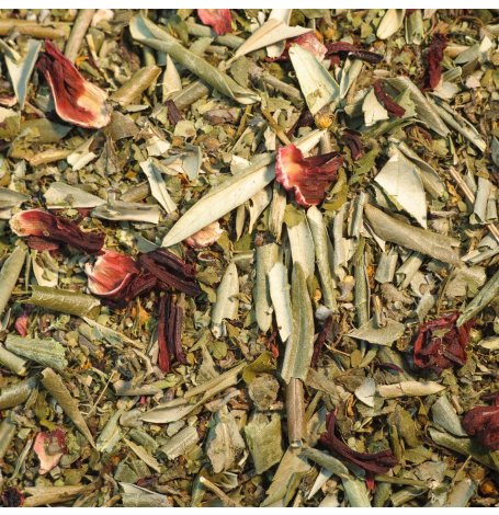 Composition de la tisane du Sportif : Maté (feuilles), Guarana (semences), Menthe poivrée (feuilles), Cassis (feuilles), Ortie (feuilles), Tilleul (aubier), Hibiscus (fleurs), Citronnelle (plante entière).