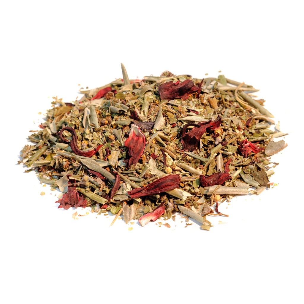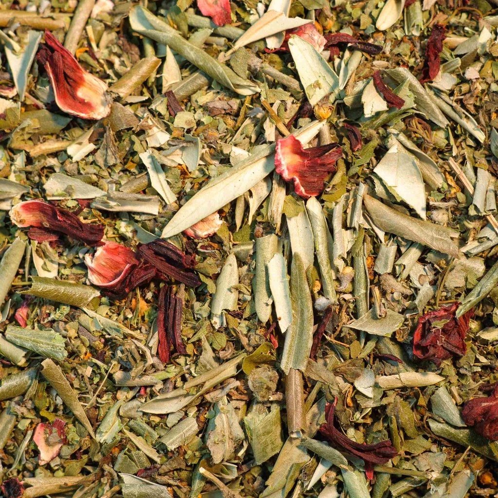 Composition de la tisane Tension : Olivier (feuilles), Aubépine (sommités fleuries), Marjolaine (feuilles), Hibiscus (fleur), Piloselle (partie aérienne).