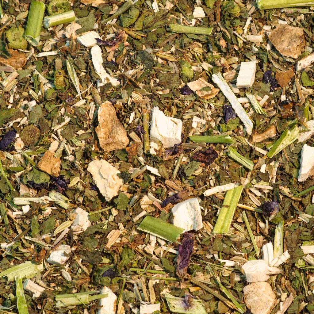 Composition de la tisane Transit : Fenouil (semences), Chicorée (feuilles), Guimauve (racines), Mauve (sommités fleuries), Chicorée (racines), Menthe poivrée (feuilles).
